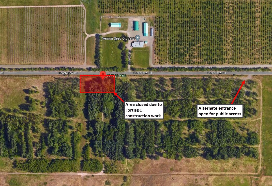 The access point, located across from the Vernon Seed Orchard, will be closed intermittently from Monday, June 26 until August 31. Additionally, a small area of the park will be fenced off to the public during the construction period for safety purposes.