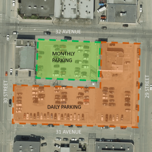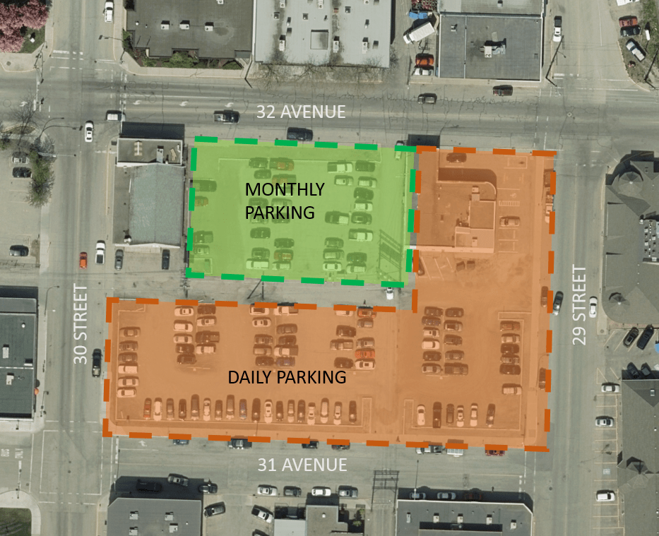 The City of Vernon will be designating the location of where the monthly and daily parking pass holders are to park within the 32 Avenue parking lot. Both signage and barriers will be installed as per the sections identify in the accompanying map.