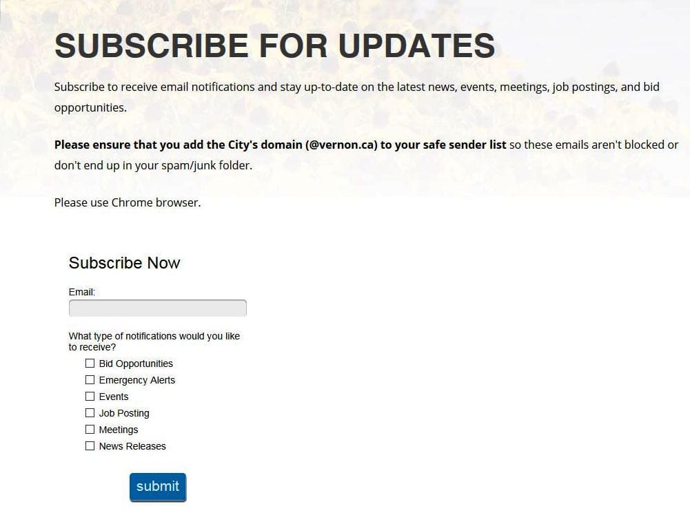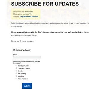 Go to www.vernon.ca/subscribe, enter your email address, and check the boxes to indicate the updates you want to receive. You can change or cancel your choices at any time.