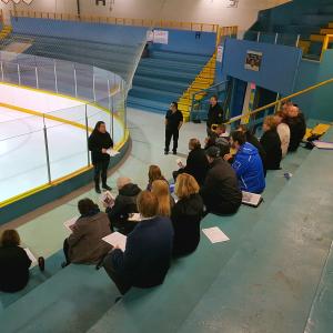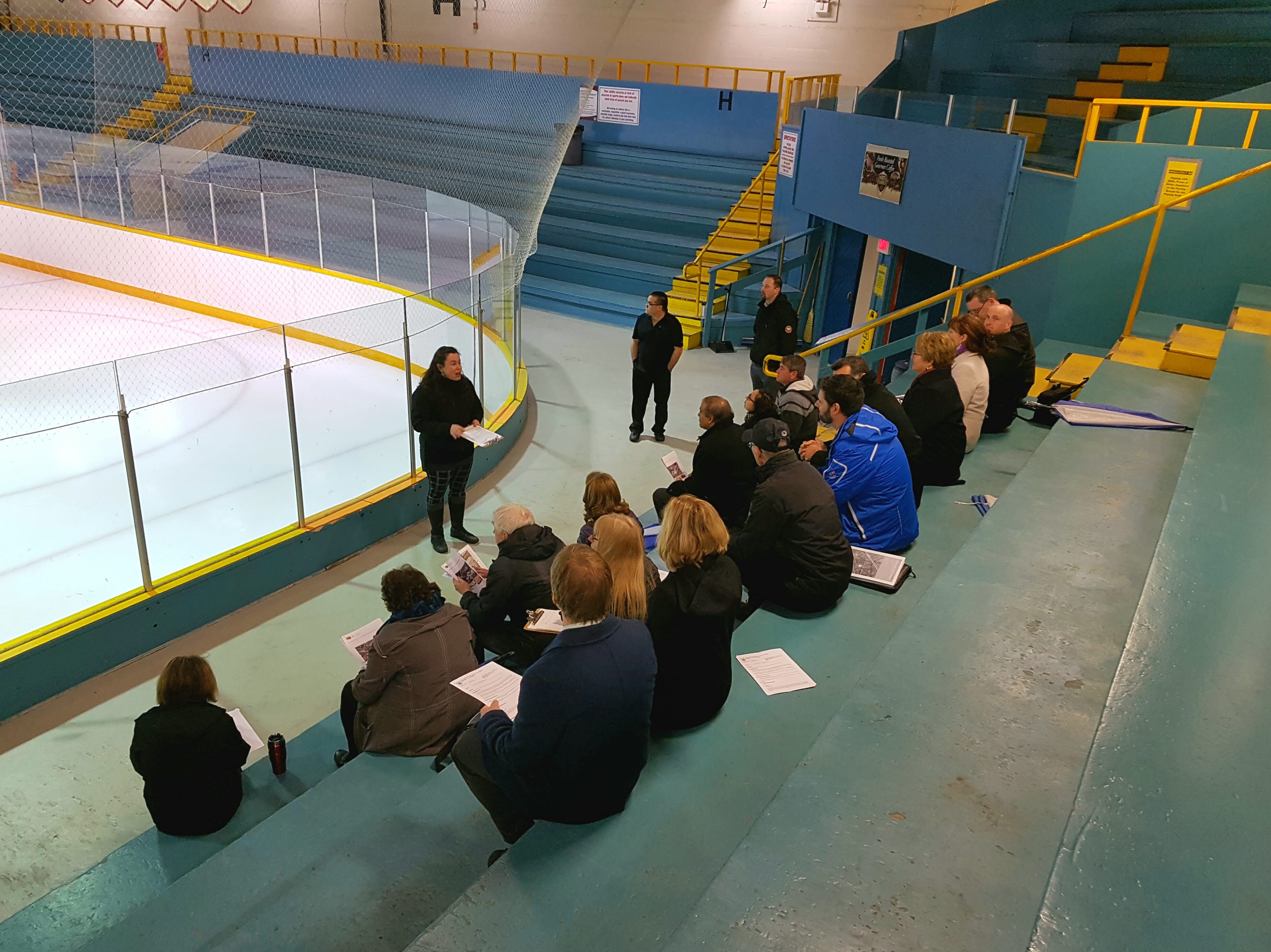 Photo: Cleo Corbett, Long Range Planner, provides Vernon Council and staff with information on current plans for Civic Arena block and potential costs for repurposing the arena on a tour of the site.