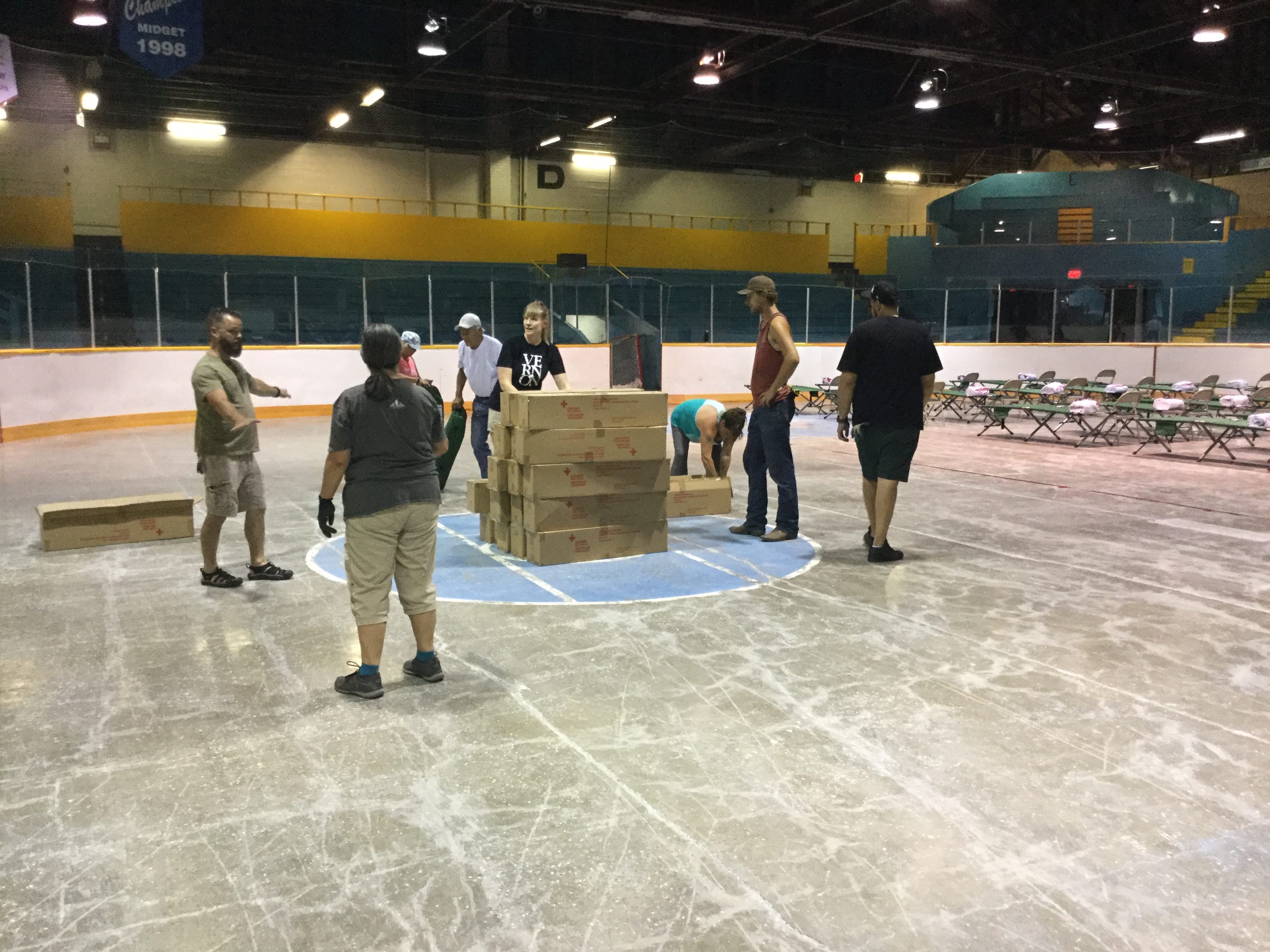 Photo: Volunteers set up cots for group lodging at the Civic Arena on Sunday afternoon.