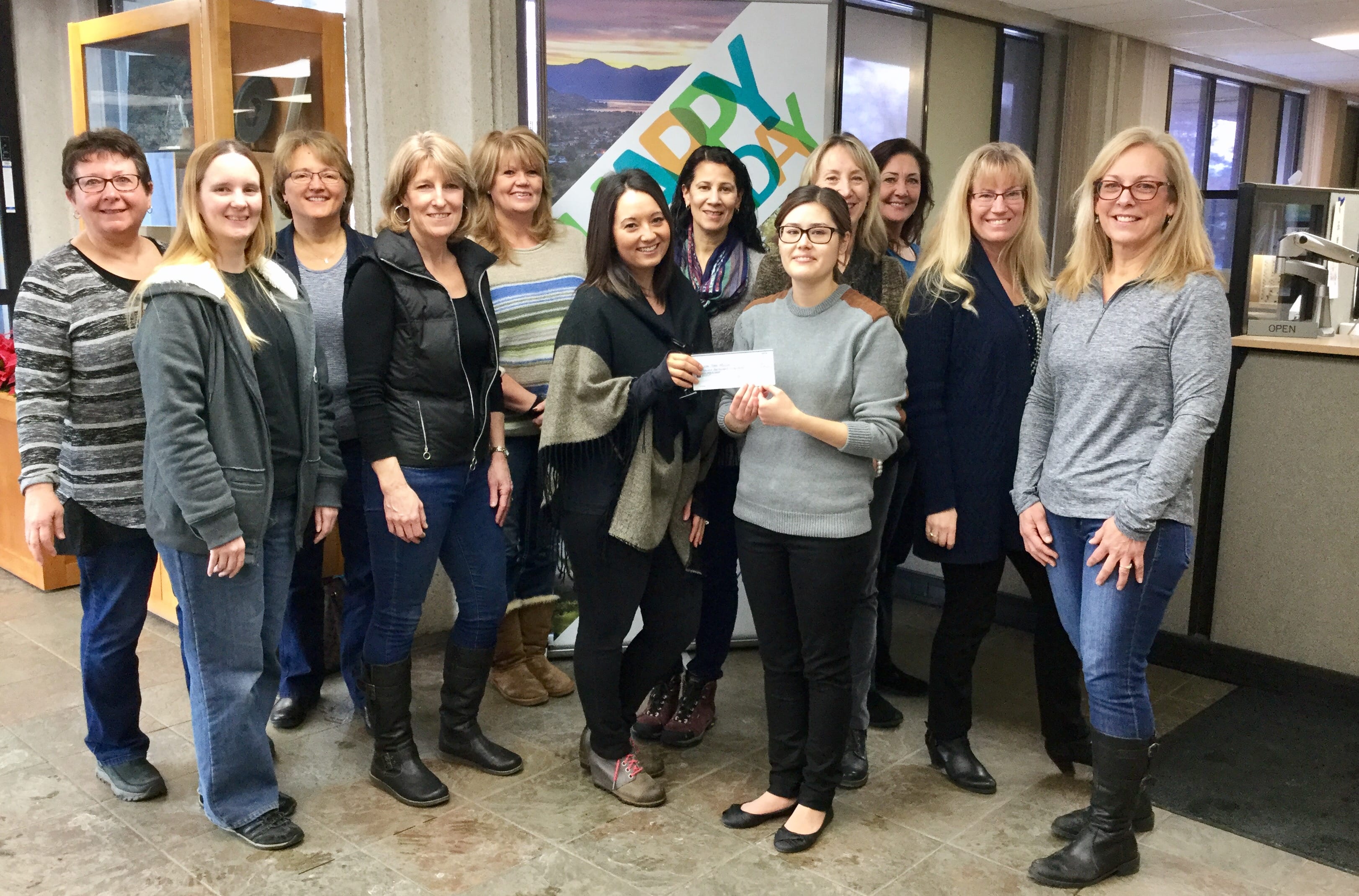 Photo: Staff from the City of Vernon present a cheque to Lisa Anderson (centre) from Upper Room Mission. (L to R) Deanna Bodden, Catharine Barker, Debra Law, Janice Nicol, Anne Marie Foster, Lisa Anderson (from Upper Room Mission), Rosemarie McKeage, Kirin Natsuhara, Maria Doyle, Sherri Biluk, Sue Blakely and Alison Levorson.