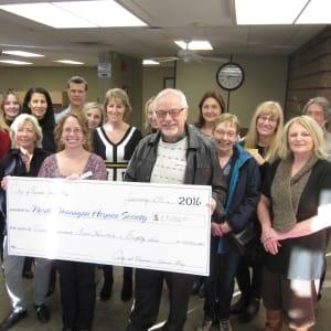 Employees at City of Vernon raised over $1,586 for the North Okanagan Hospice Society—by wearing jeans. Every Friday, City staff are invited to wear their jeans to work if they donate to a designated local charity. The North Okanagan Hospice Society was chosen by City employees in 2015 in order to support their important mission of providing respect, comfort and compassion for palliative patients and their loved ones.