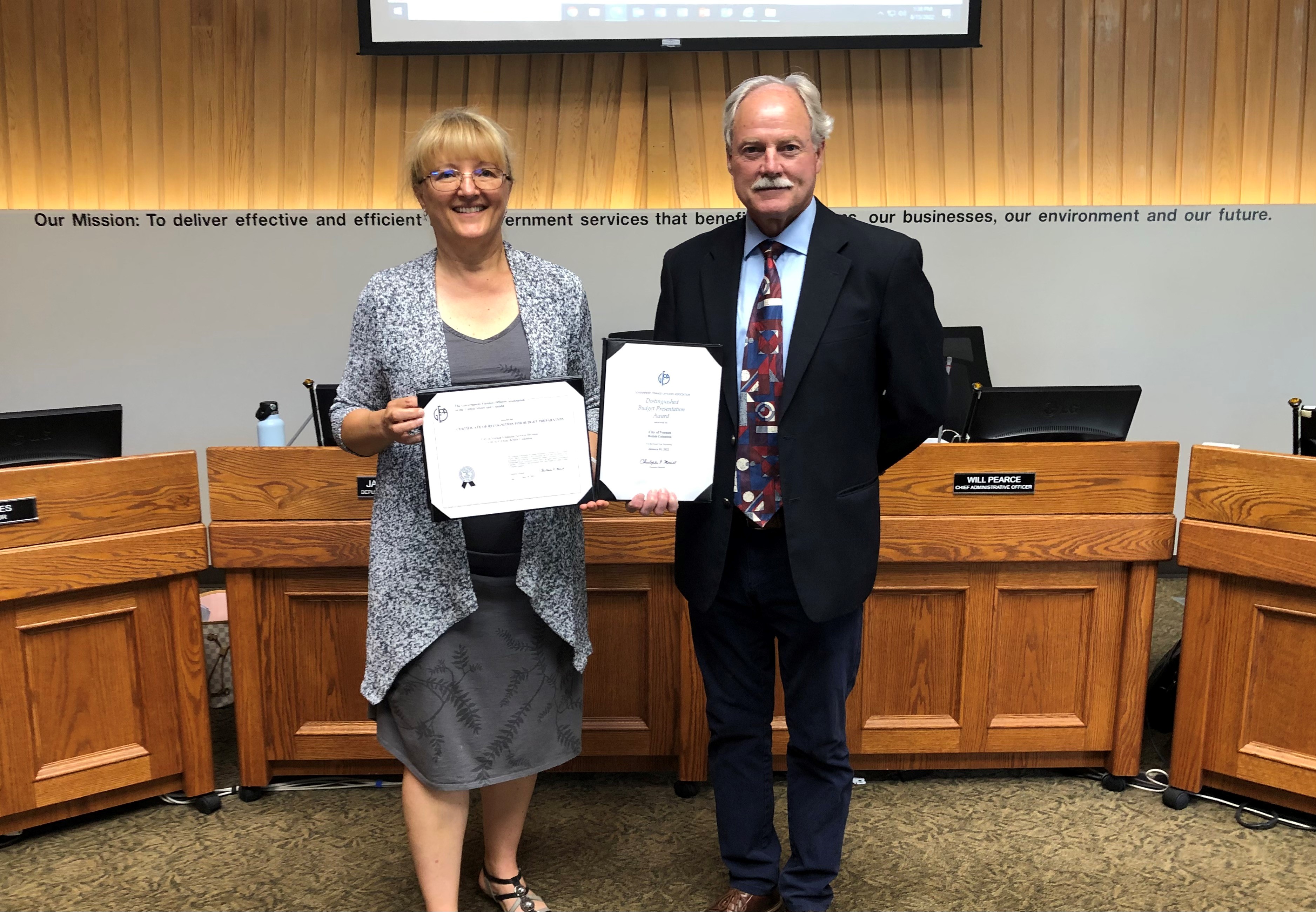 When a Distinguished Budget Presentation Award is granted to an entity, a Certificate of Recognition for Budget Presentation is also presented to the individual(s) or department designated as being primarily responsible for having achieved the award. This has been presented to the City of Vernon’s Financial Services department.