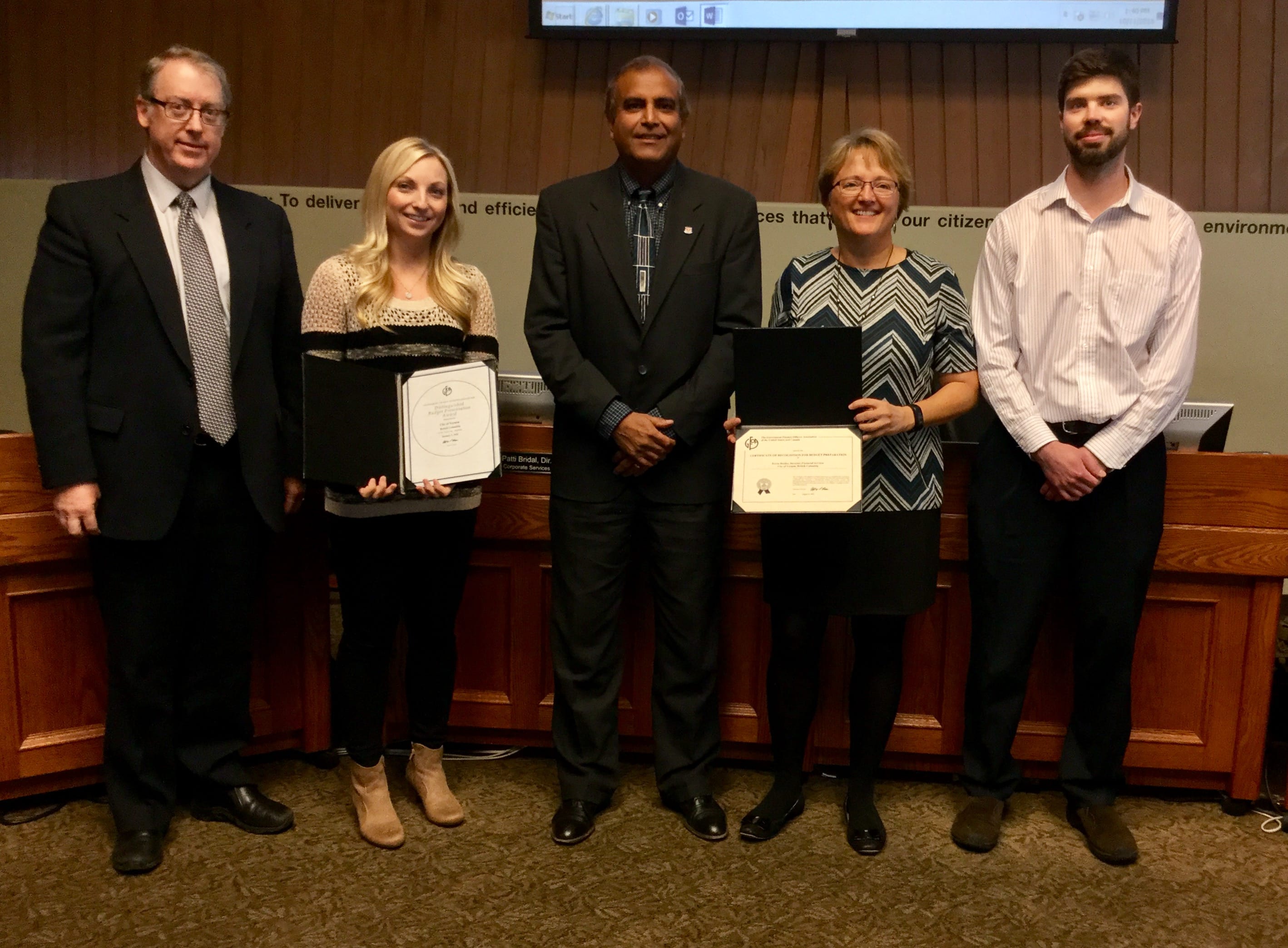 Photo: (L to R) Kevin Bertles, Director of Financial Services; Jodi Barrie, Administrative Assistant; Mayor Akbal Mund; Debra Law, Manager of Financial Planning and Reporting; Aaron Stuart, Financial Analyst. Missing from the photo is Cindy Barker, Manager of Revenue Services.