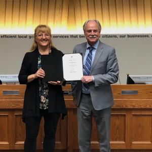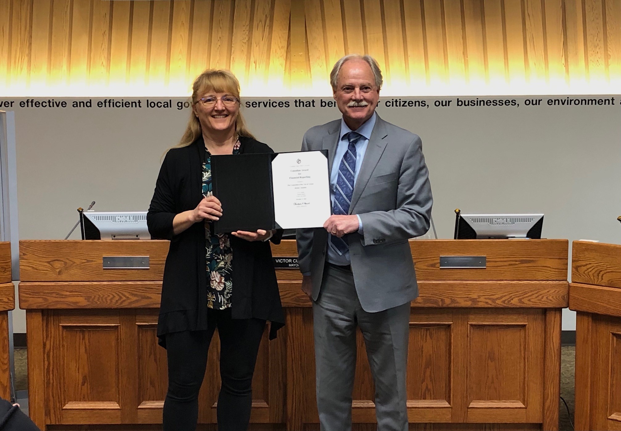 Debra Law, Director of Financial Services, receives the Canadian Award for Financial Reporting award from Mayor Victor Cumming.