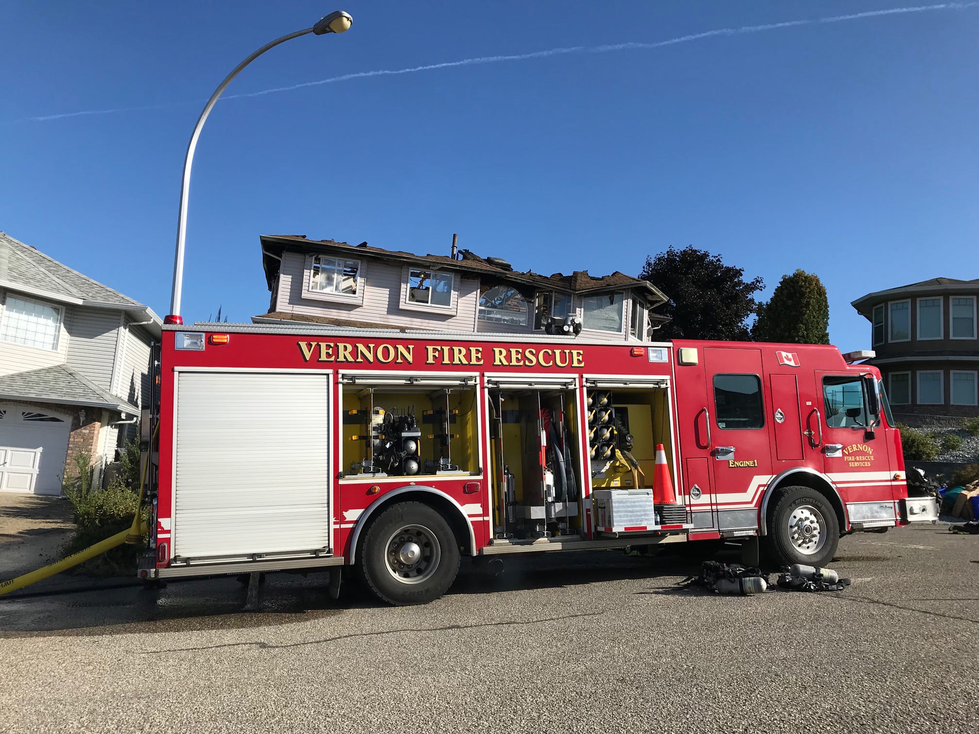 On August 22, 2019 Vernon Fire Rescue Services (VFRS) responded to a report of a fire in a yard. The fire spread to some tall cedar trees close to the home and then quickly into the attic space of the home. When the first fire engine and crew arrived on-scene, approximately seven (7) minutes after the 911 call was placed, the fire was already burning through the roof of 3755 Commonage Place and was extending to 3759 Commonage Place. The firefighters were able to prevent the spread of fire to 3759 Commonage Place with minimal exterior damage to the home.