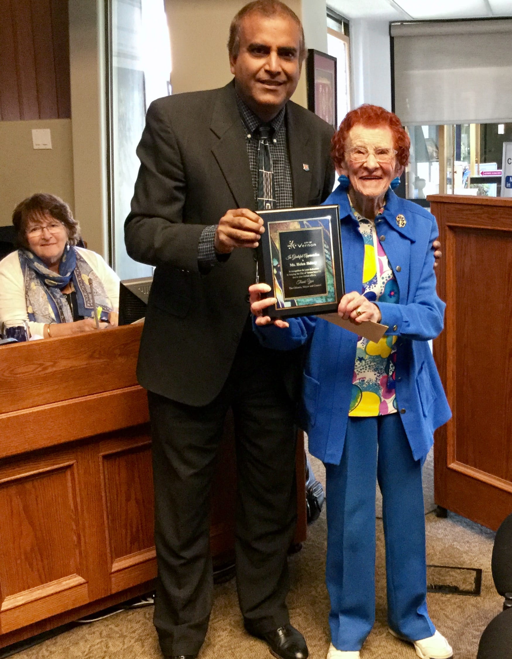 Today in the Regular Meeting of Council, Mayor Akbal Mund recognized longtime Vernon resident Helen Sidney for her years of helping to improve her community. Ms. Sidney is vigilent in keeping the road along popular Bella Vista Road litter-free, an example she modelled for her students for more than 40 years of teaching.