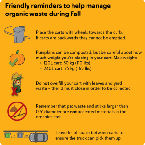 Fall has arrived in the North Okanagan and to coincide with the seasonal change, the City is offering tips and reminders to help residents manage their organics carts to ensure carts can be completely emptied during collection.