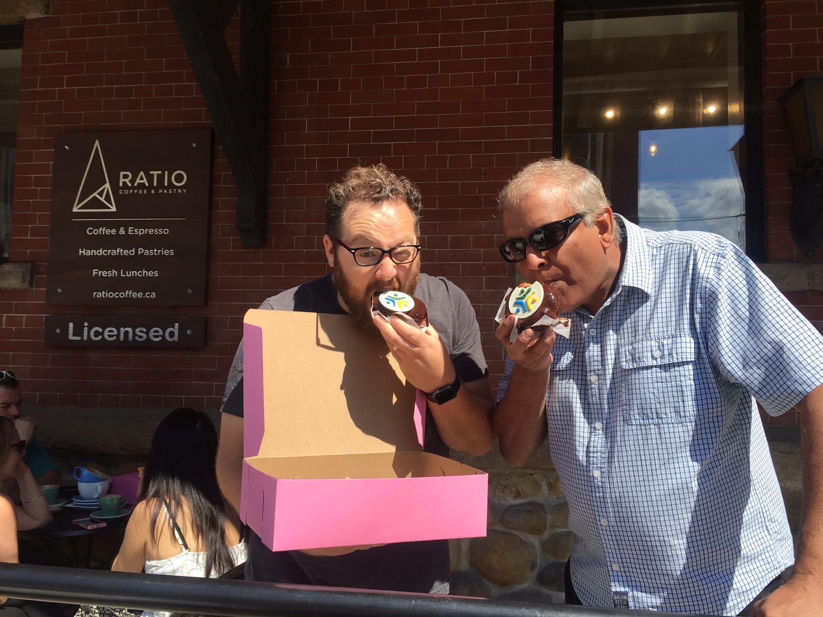 Photo: Ratio Coffee and Pastry owner Andrew McWilliam and Mayor Akbal Mund enjoy double chocolate tourism donuts featuring the City's logo.