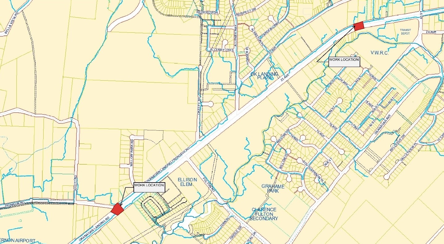Starting as early as Monday, May 2, crews will be working at the intersection of Okanagan Landing Road and Tronson Road, as well as on 25th Avenue near the Vernon Water Reclamation Centre. Traffic in those areas will be reduced to single lane alternating while the work takes place.