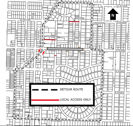 Construction will begin as early as Monday, July 10, and is expected to continue until Fall 2023. The road will be accessible to local traffic only during construction. Detour routes will be available to the north and south on 37th Avenue and 25th Avenue (please see map below).
