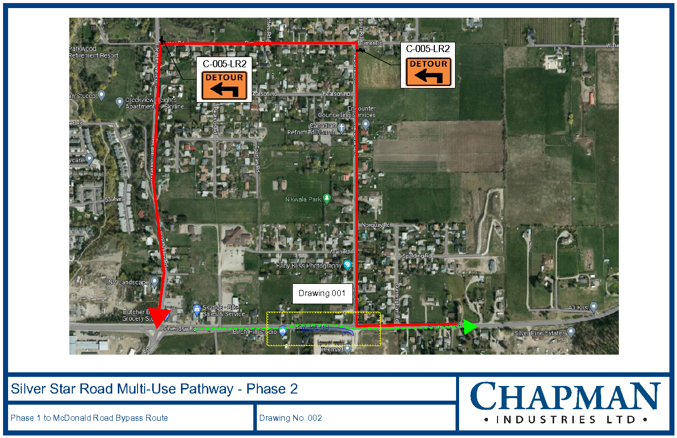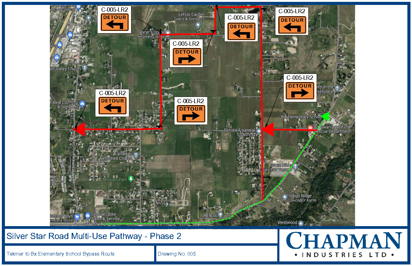 Motorists are encouraged to routinely check the City of Vernon website for updates on the Silver Star Road multi-use path project and marked traffic detours. Information can be found at www.vernon.ca/roadconstruction by clicking on the City’s interactive roadwork map.