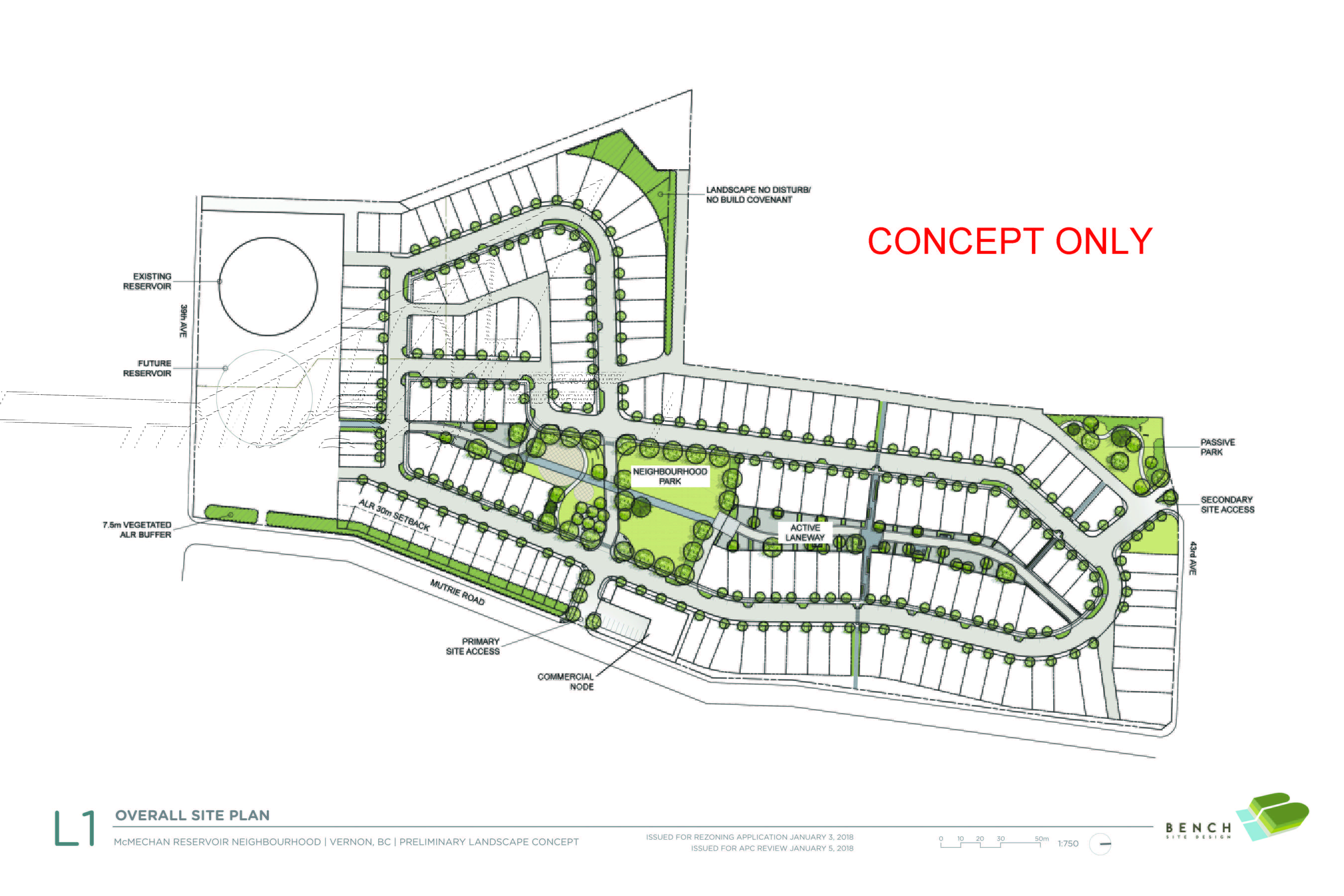 City of Vernon Council received a presentation on January 22, 2018 on preliminary development concepts for the 20 acre McMechan reservoir site located at 901 39 Avenue. Vernon Reservoir Developments Ltd. and their design team, including Bluegreen Architecture - the architecture firm behind The Outback development, presented a neighbourhood concept with approximately 170 homes, a new park and trail system and walkable streets designed to slow automobile traffic while encouraging travel by foot and by bike.