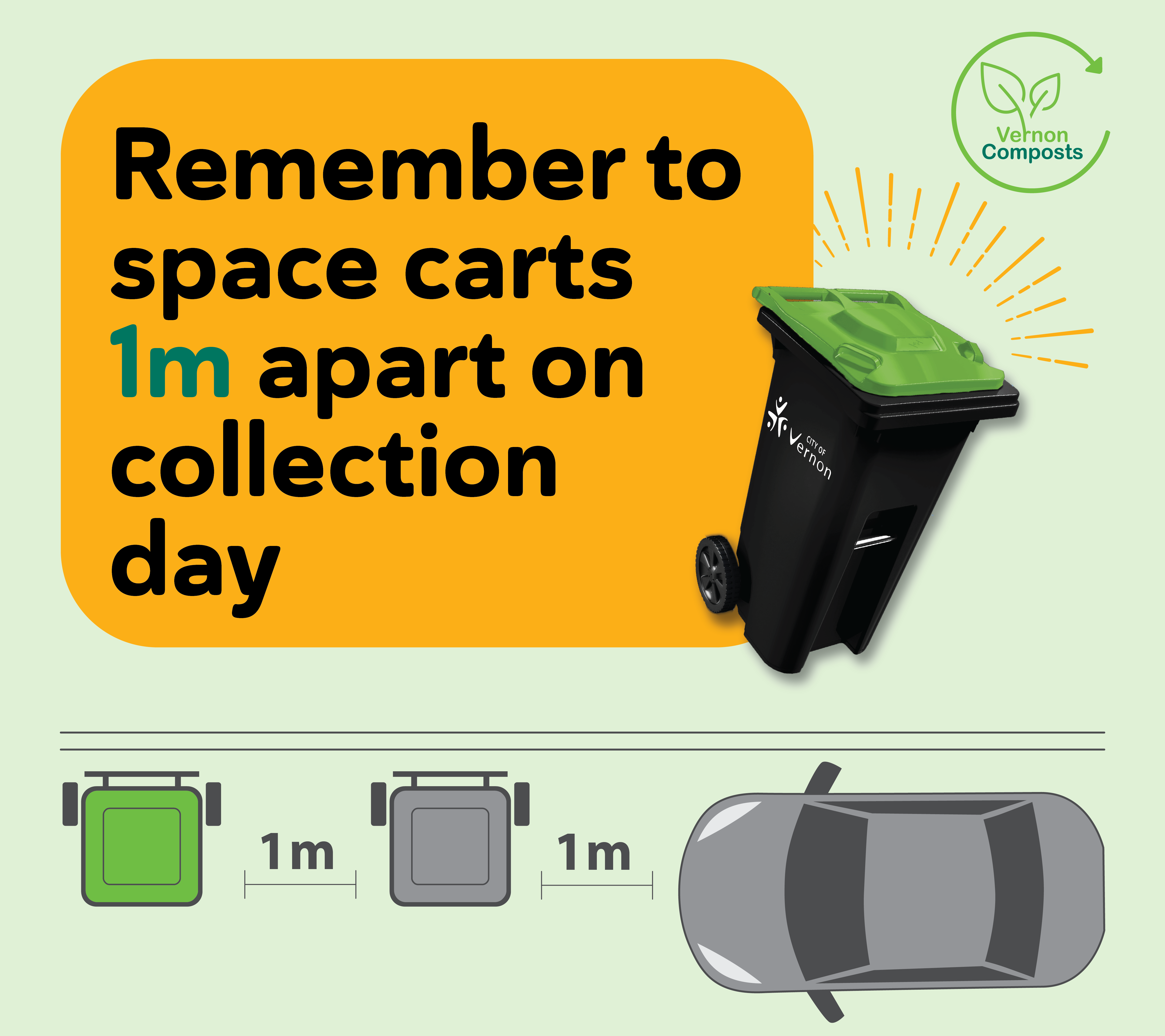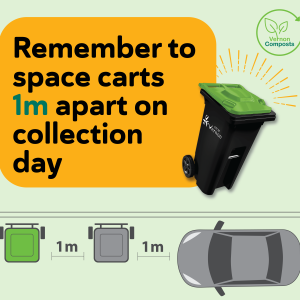 To assist crews, residents are reminded to place carts at the curb as shown in the printed guide, giving at least one metre of distance (i.e., arm’s length) from all other objects, including other carts placed at the curb.