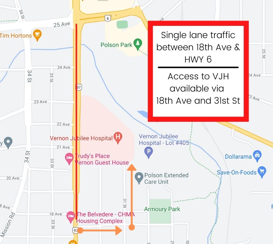 To access the Vernon Jubilee Hospital, motorists are asked turn east onto 18th Avenue and then north on to 31A or 31st Street. Motorists are asked to obey all traffic control measures and to avoid traveling through the construction zone for the safety of workers and the public.
