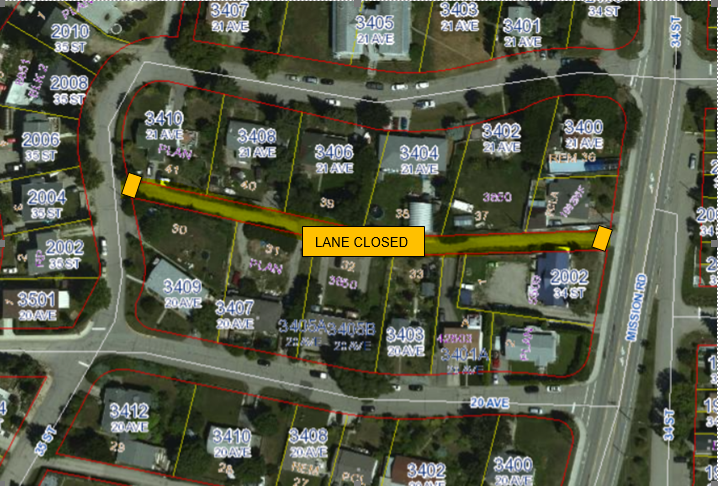 A laneway between Mission Road and 35th Street will be closed for several days while crews complete upgrades to sanitary infrastructure in the area. The lane is located behind homes in the 3400-blocks of 20th and 21st Avenues.