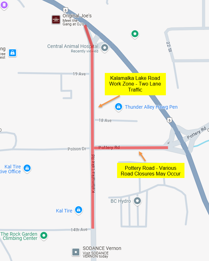 Starting as early as 7:00 a.m. on Wednesday, December 4, Kalamalka Lake Road will be reduced to two lane traffic between 14th Avenue and Highway 6. Work may also require road closures on Pottery Road between Kalamalka Lake Road and Highway 6 (please see map below).
