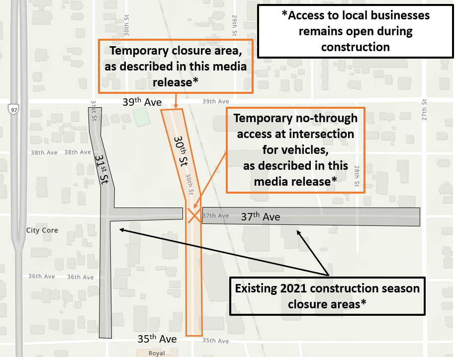 Access along the multi-use path for pedestrians, cyclists, and other path users will be possible via a slight detour at the intersection 30th Street and 37th Avenue. A temporary gravel surface may require path users to dismount. Access to local businesses in the area will be maintained throughout construction. Residents are encouraged to continue supporting local businesses.