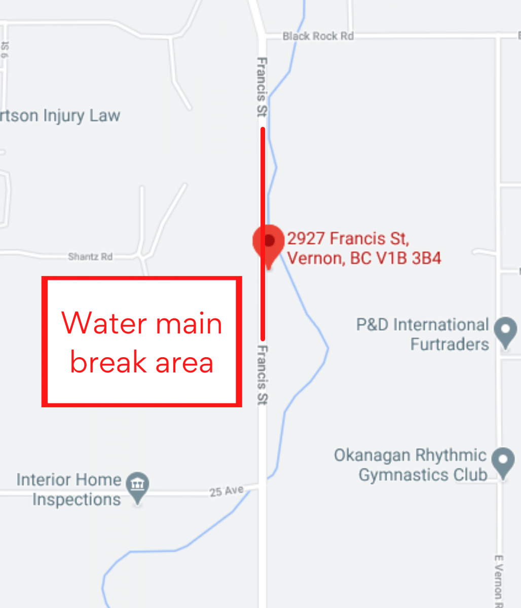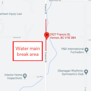 The City of Vernon would like to advise the public that utility crews are repairing a water main break that has occurred in the 2900 block of Francis Street.