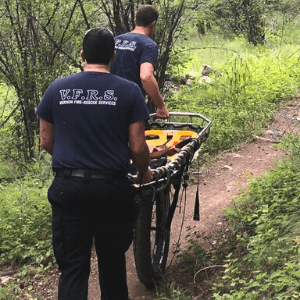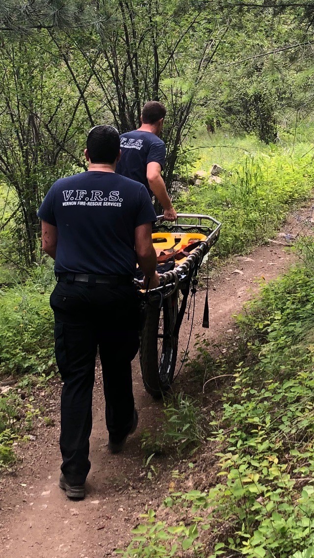 Vernon firefighters using a fat tire to help transport a patient out of Ellison Park. (Photo captured June 4, 2020)