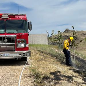 The fire grew to approximately 500 ft x 200 ft before crews could start to get it under control. BC Wildfire Service has been called for assistance. At this time, there is no impact to traffic.