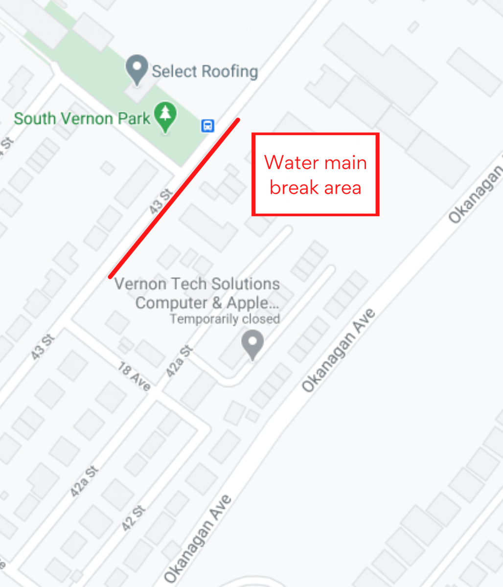 The City of Vernon would like to advise the public that utility crews are repairing a water main break that has occurred in the 1900 block of 43rd Street.