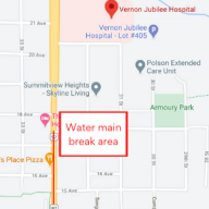 The City of Vernon would like to advise the public that utility crews are repairing a water main break that has occurred in the 1600 block of 32nd Street (HWY 97), south of the Vernon Jubilee Hospital.