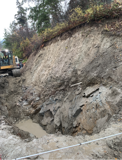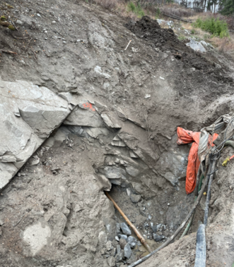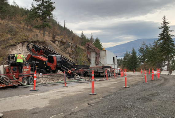 The contractor continues to advance the installation of the directionally drilled storm main between Kokanee Road and Smith Road. Progress has been slower than anticipated due to challenging bedrock conditions encountered along the alignment. To mitigate schedule delays, the contractor has requested approval to extend working hours and run additional shifts to complete the drilling portion of the work. Staff are working with the contractor to balance construction productivity with potential impacts to residents.  The picture below shows the receiving pit on Smith Road for the directional drilling.